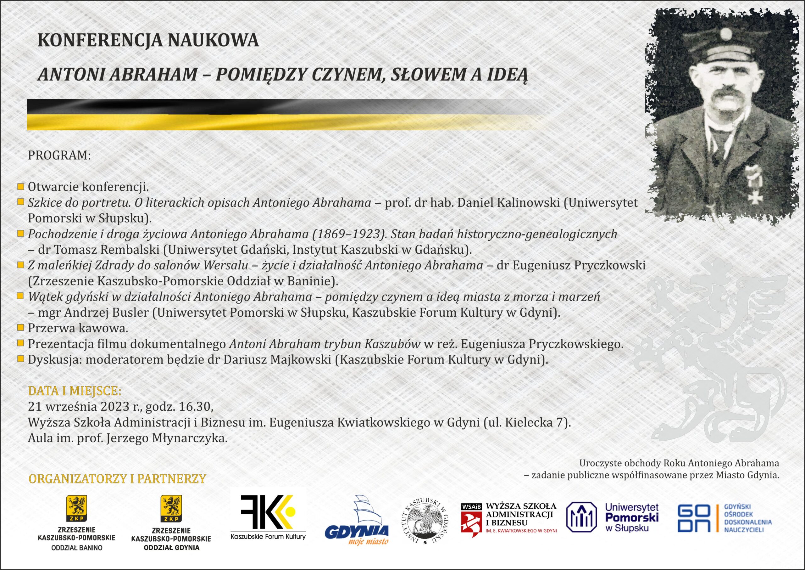 Wątek gdyński w działalności Antoniego Abrahama – pomiędzy czynem a ideą miasta z morza i marzeń ‒ mgr Andrzej Busler (Uniwersytet Pomorski w Słupsku, Kaszubskie Forum Kultury w Gdyni).
