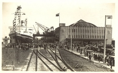 Dworzec morski i cumujący przy nabrzeżu francuskim transatlantyk „Piłsudski”. Archiwum Marek Seyda