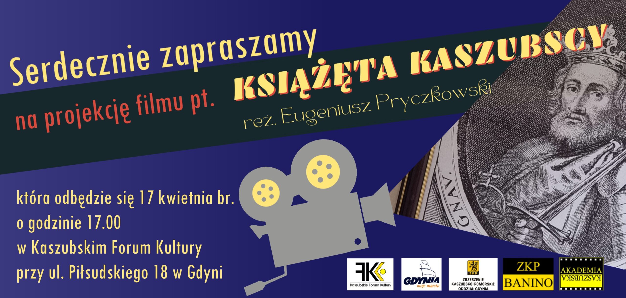 Kaszubskie Forum Kultury i Gdyński Oddział Zrzeszenia Kaszubsko-Pomorskiego serdecznie zapraszają na projekcje filmu „Książęta Kaszubscy” w reżyserii Eugeniusza Pryczkowskiego ‒ 17 kwietnia o godzinie 17:00 w naszej siedzibie (al. Marszałka Piłsudskiego 18).