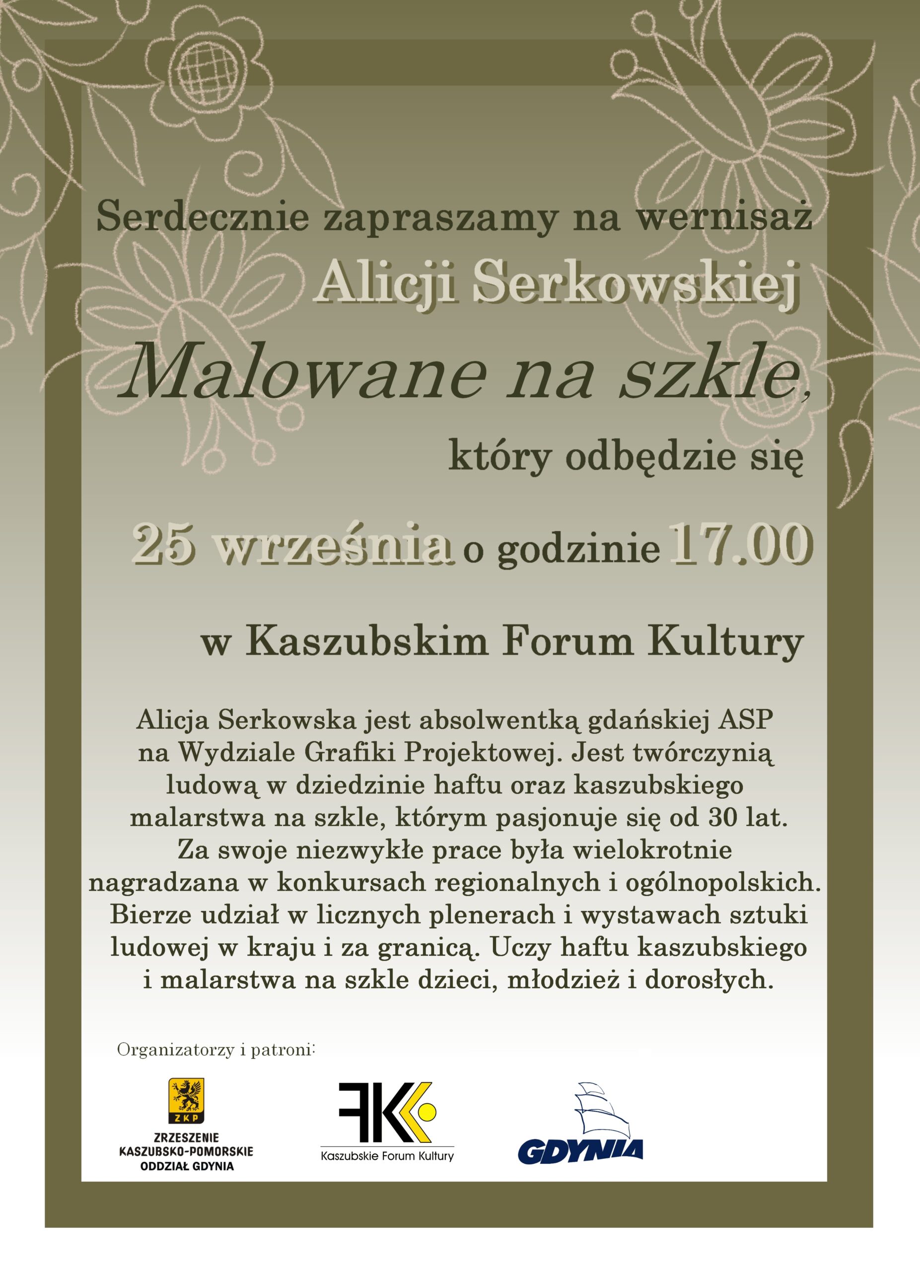 Serdecznie zapraszamy na wernisaż Alicji Serkowskiej Malowane na szkle, który odbędzie się 25 września o godzinie 17.00 w Kaszubskim Forum Kultury.