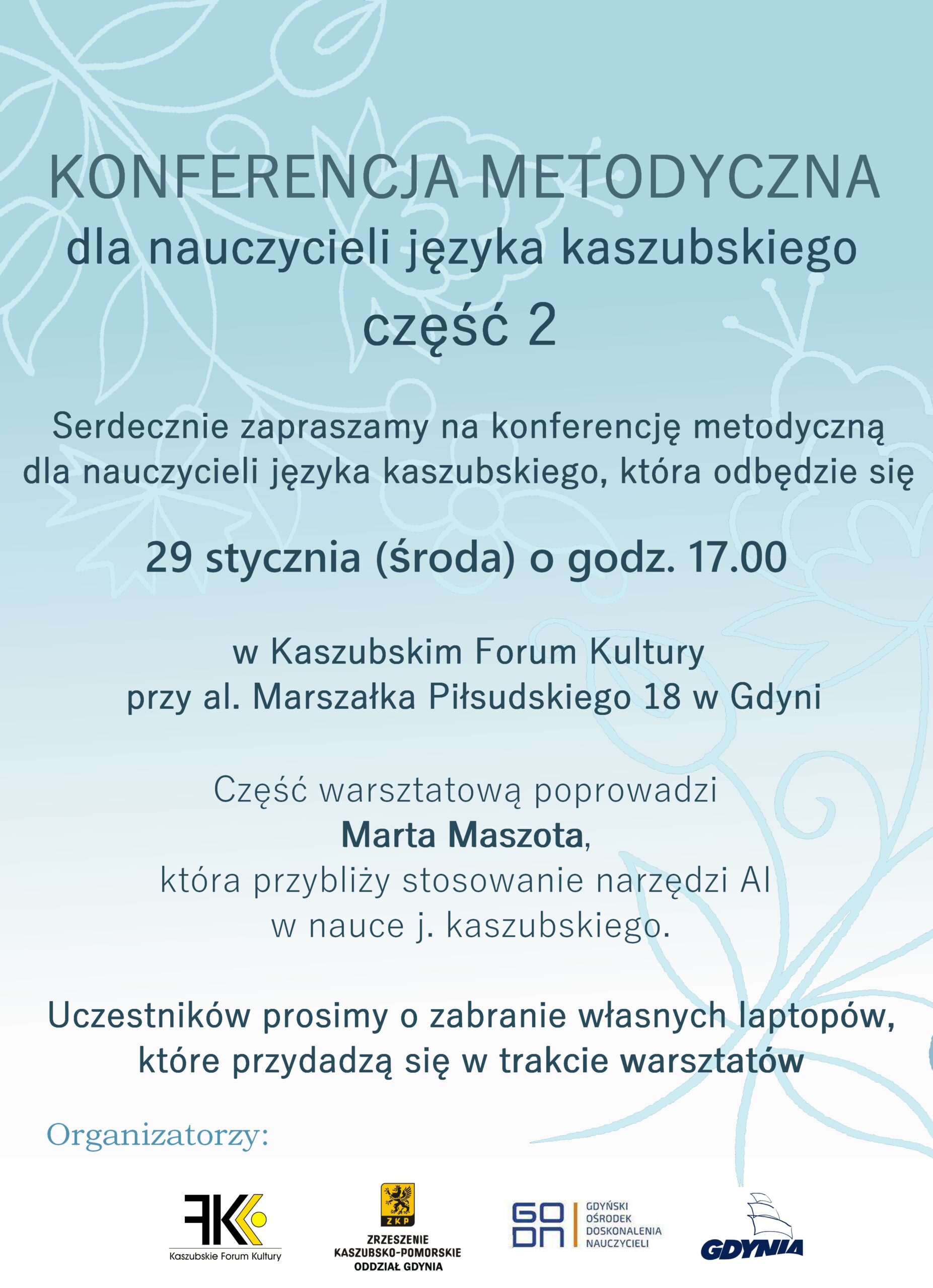 Serdecznie zapraszamy na spotkanie nauczycieli języka kaszubskiego, które odbędzie się 29 stycznia o godz. 17.00 w siedzibie Kaszubskiego Forum Kultury w Gdyni (al. Marszałka Piłsudskiego 18). Gorąco zapraszamy także dyrektorów szkół, w których jest nauczany ten język oraz wszystkich, którym jest bliski regionalizm kaszubski i chcą podejmować działania w tej kwestii w sferze edukacji.