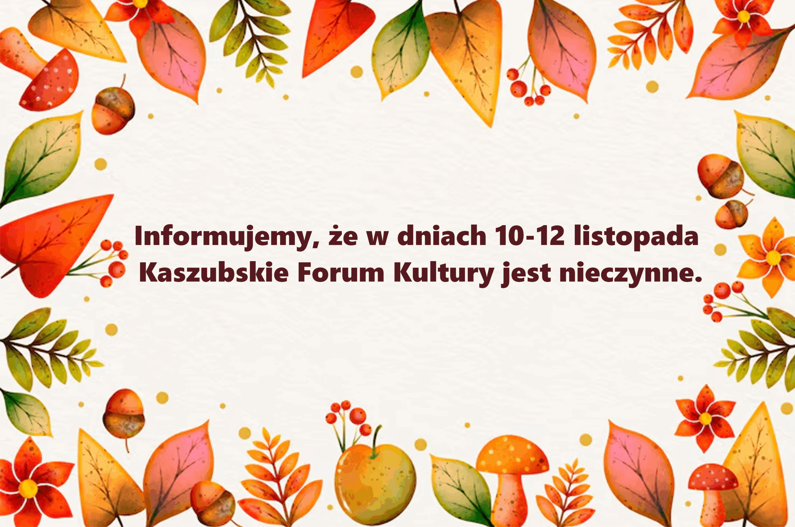 Informujemy, że w dniach 10-12 listopada Kaszubskie Forum Kultury jest nieczynne.