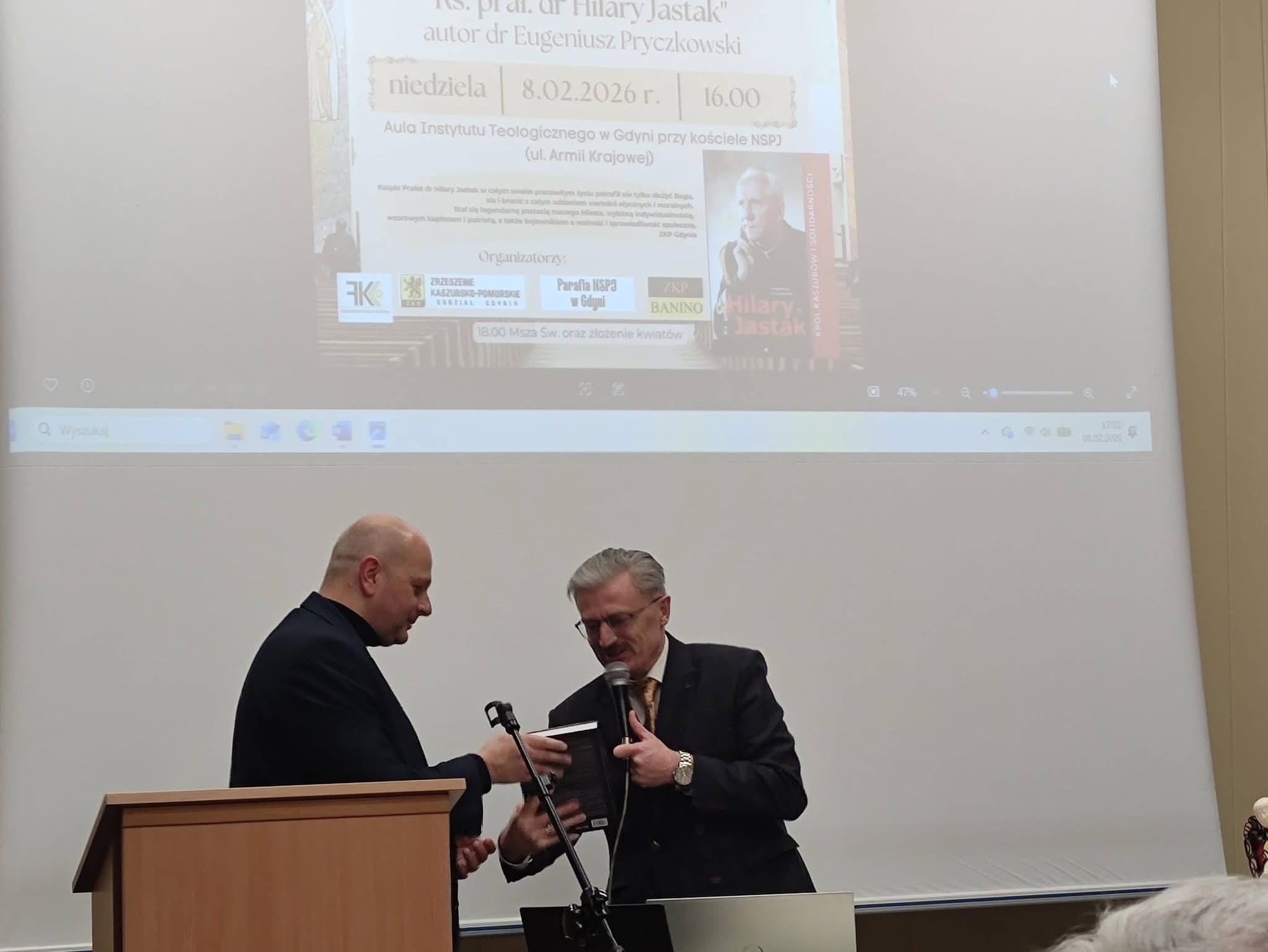 8 lutego w Auli Instytutu Teologicznego przy parafii NSPJ w Gdyni odbyła się promocja książki oraz pokaz filmu dokumentalnego „Ks. prał. dr Hilary Jastak. Król Kaszubów i Solidarności” autorstwa Eugeniusza Pryczkowskiego. Wydarzenie zgromadziło bardzo liczne grono uczestników – w spotkaniu wzięło udział około 160 osób. Spotkanie otworzyli ks. proboszcz Jacek Bramorski oraz prezes Kaszubskiego Forum Kultury Andrzej Busler.
